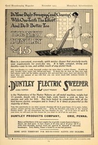 This is an original 1913 black and white print ad for the Duntley Electric Sweeper from Duntley Products Company located in Erie, Pennsylvania.