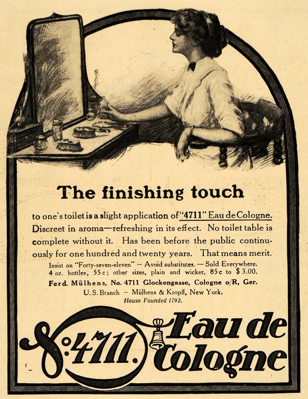 This is an original 1913 black and white print ad for Eau De Cologne from Mulhens & Kropff located in New York.