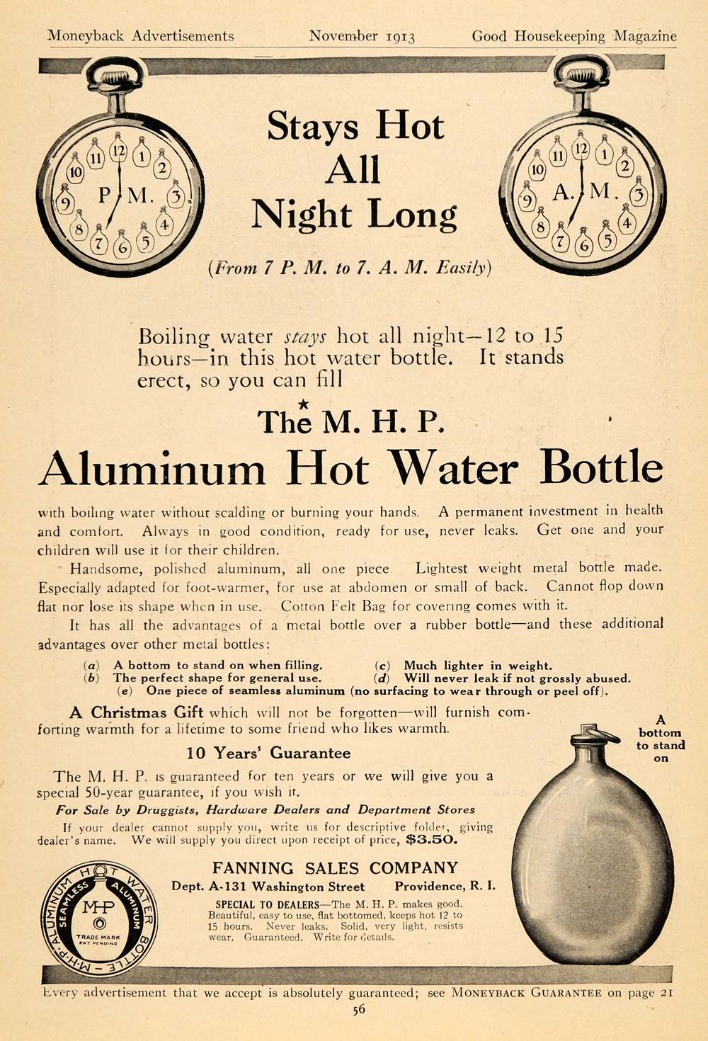 This is an original 1913 black and white print ad for the M. H. P. Aluminum Hot Water Bottle from Fanning Sales Company located at 131 Washington Street, Providence, Rhode Island.