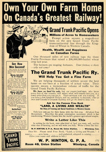 This is an original 1913 black and white print ad for Owning Your Own Farm Home on Canada's Greatest Railway, the Grand Trunk Pacific Railway.