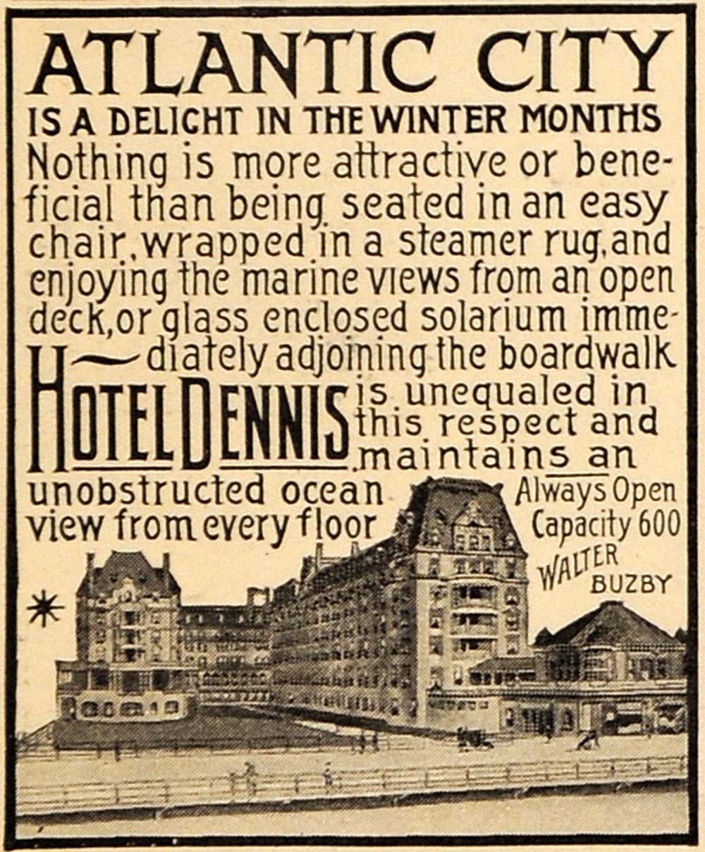 This is an original 1913 black and white print ad for the Hotel Dennis located in Atlantic City, New Jersey. This is currently owned by Bally's.