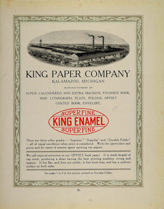 This is an original 1913 color print ad for the King Paper Company in Kalamazoo, Michigan, makers of Superfine King Enamel Printing Paper. The ad has a nice illustration of the company's factory buildings.