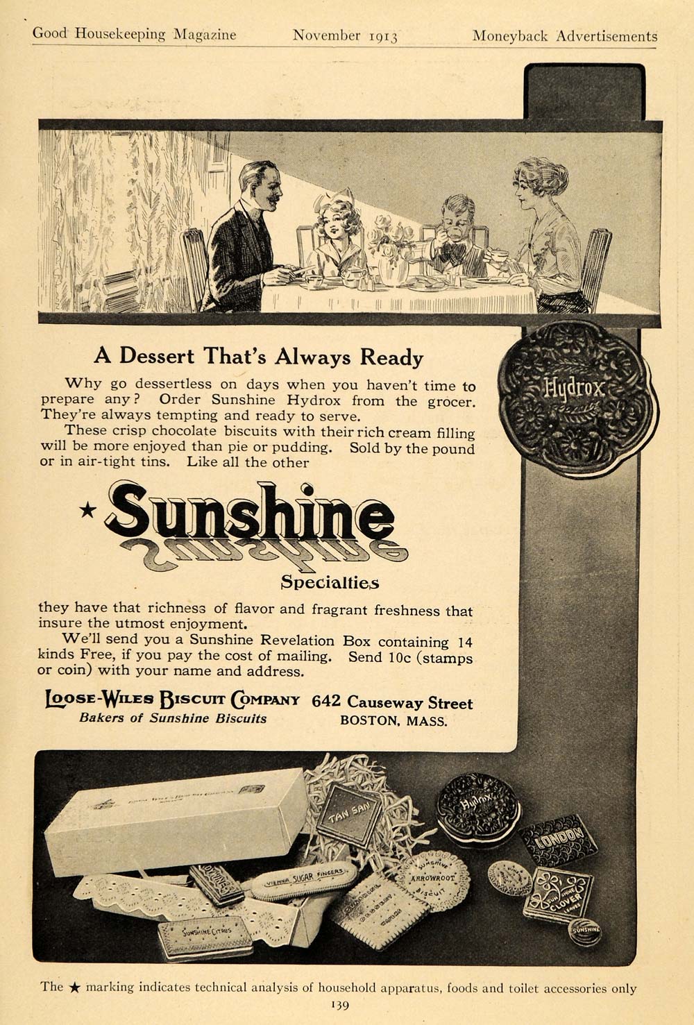 This is an original 1913 black and white print ad for the Sunshine Hydrox Biscuit from Loose-Wiles Biscuit Company located at 642 Causeway Street, Boston, Massachusetts.