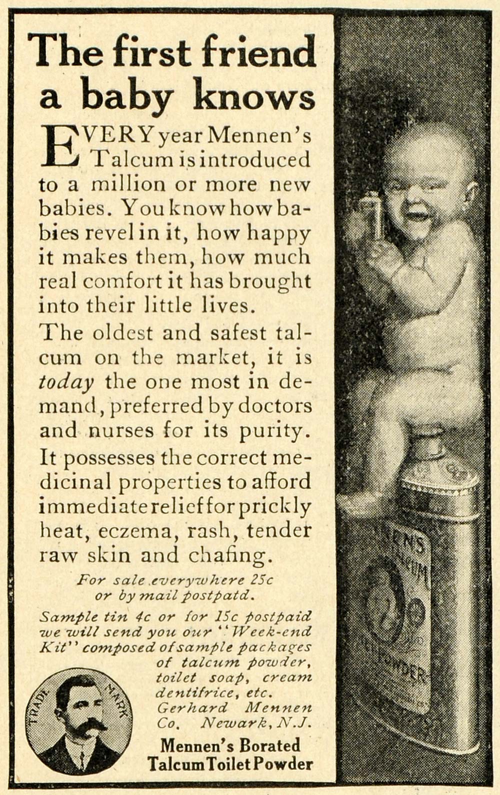 This is a small original 1913 black and white print ad for Mennen's Borated Talcum Toilet Powder, a product line by the Gerhard Mennen Company in Newark, New Jersey.