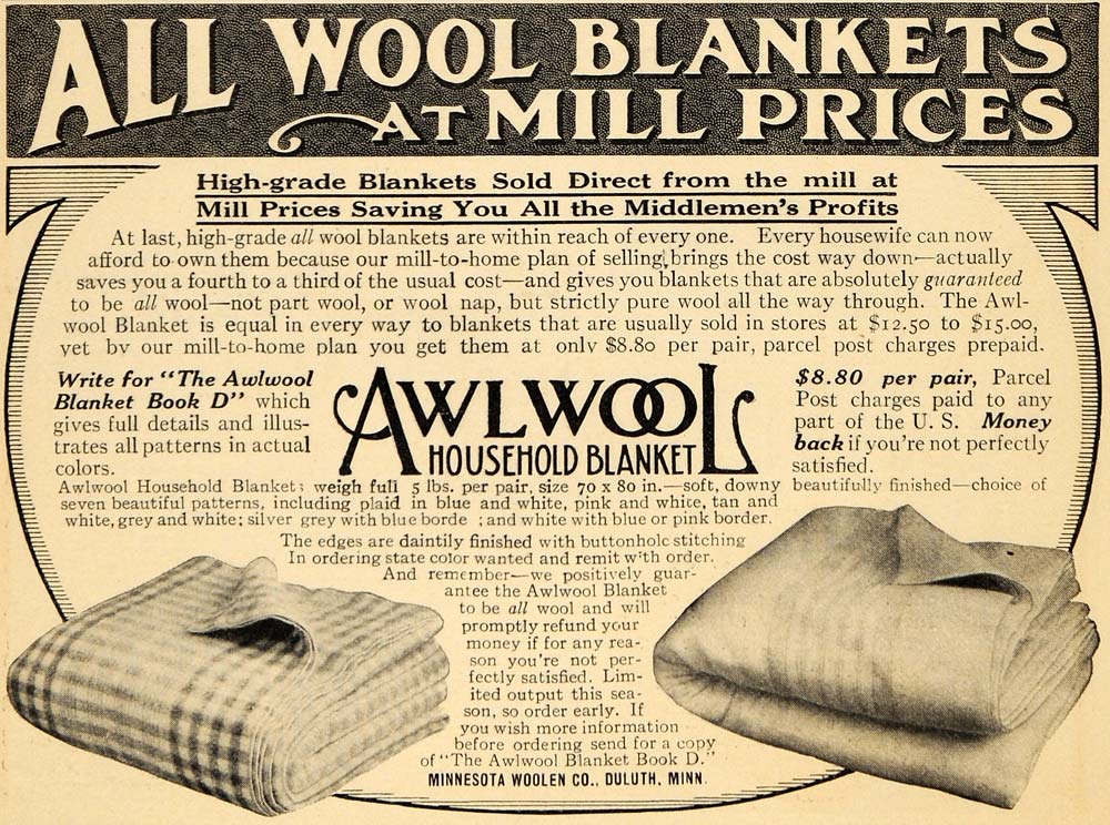 This is an original 1913 black and white print ad for the Awlwool Household Blanket from Minnesota Woolen Company located in Minnesota.