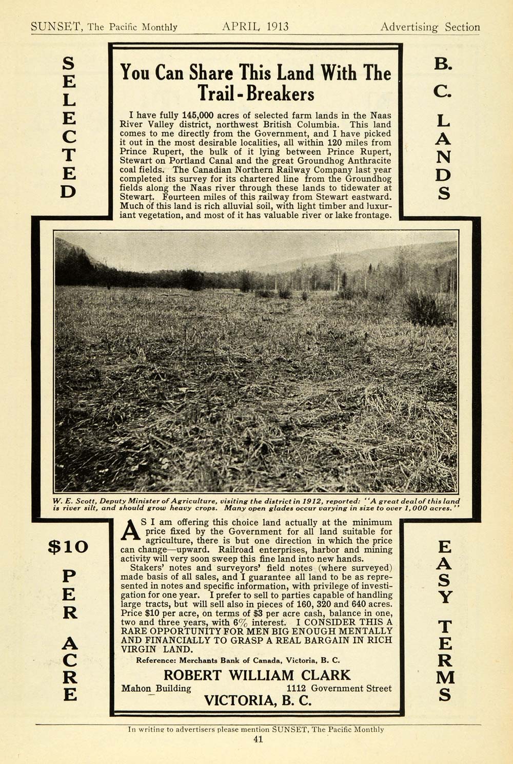 Keywords specific to this image: Vintage Advertising, Acreage, Pricing, W. E. Scott, Farming, Prince Rubert, Portland Canal, Canadian Norhtern Railway, Real Estate, Victoria British Columbia, Mahon Building