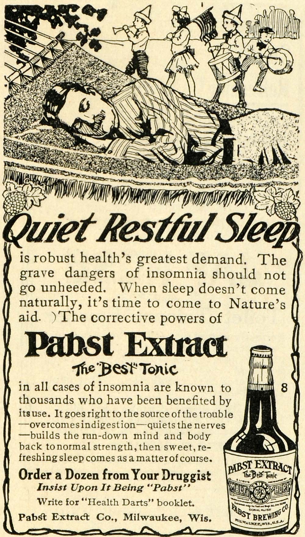 Keywords specific to this image: Vintage Advertising, Children, Marching Band, Insomnia, Bottle
