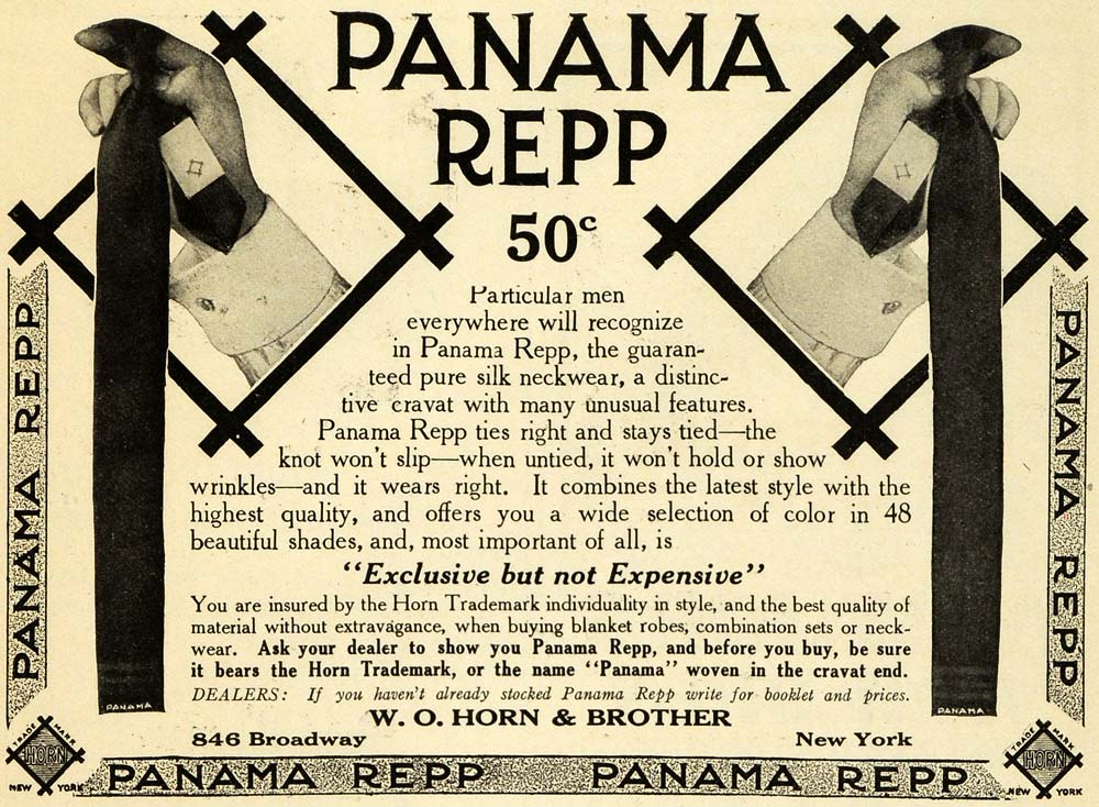 This is an original 1913 black and white print ad for Panama Repp silk ties, a product line by W. O. Horn and Brother, located at 846 Broadway in New York.