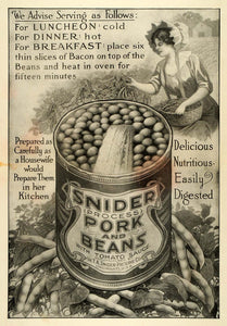 This is an original 1913 black and white print ad for Snider Pork and Beans with tomato sauce, a product line by The T. A. Snider Preserve Company in Cincinnati, Ohio.