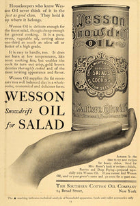 This is a rare early original 1913 black and white print ad for the Wesson Snowdrift Oil for Salads from Southern Cotton Oil Company located at 24 Broad Street, New York.