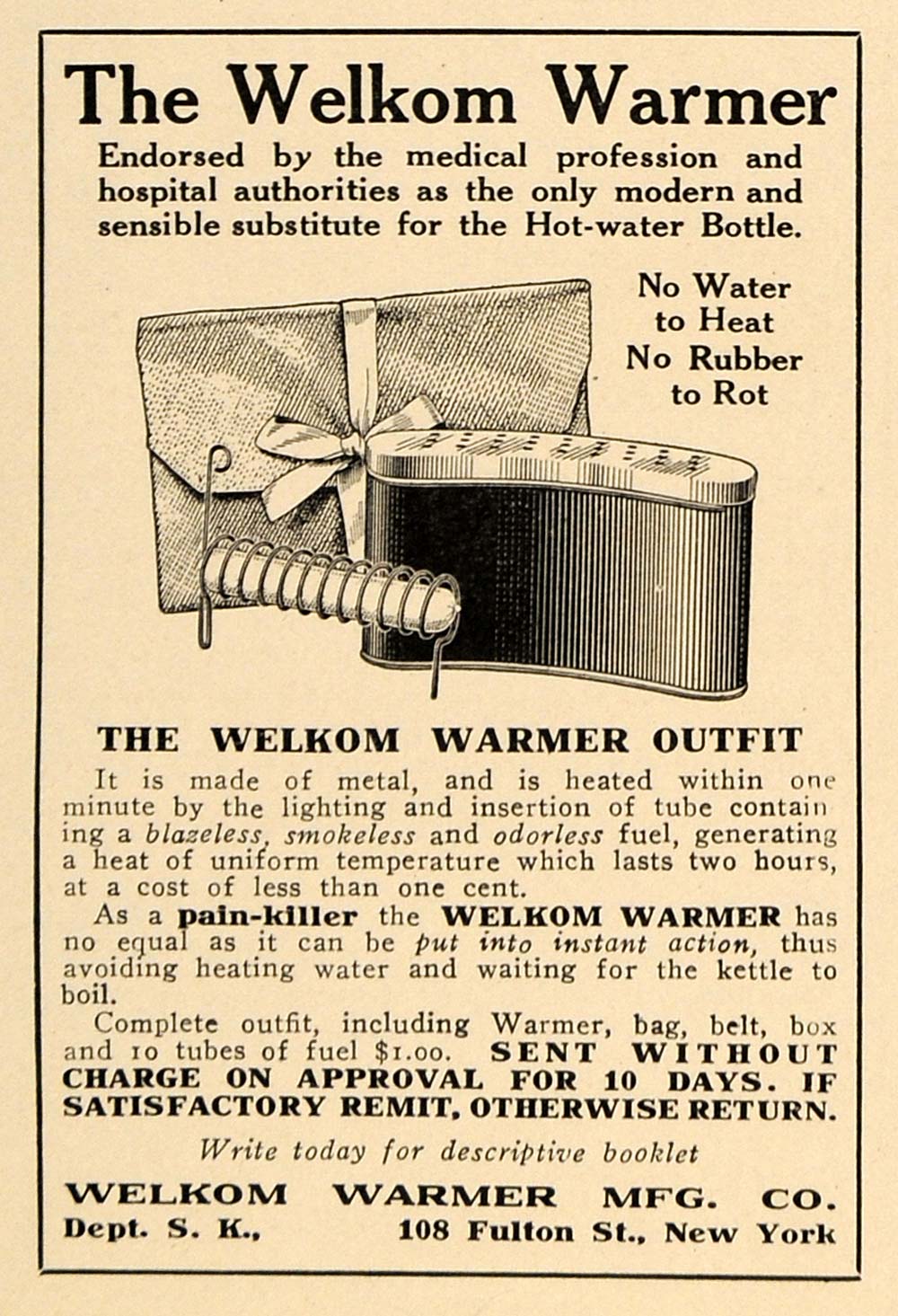 This is an original 1913 black and white print ad for Welkom Walmer from Welkom Warmer Manufacturing Company located at 108 Fulton Street, New York.