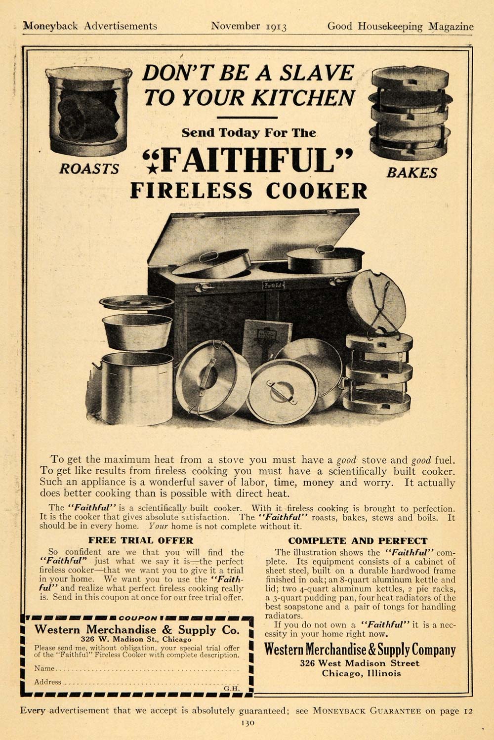 This is an original 1913 black and white print ad for the Faithful Fireless Cooker from Western Merchandise & Supply Company located at 326 West Madison Street, Chicago, Illinois.