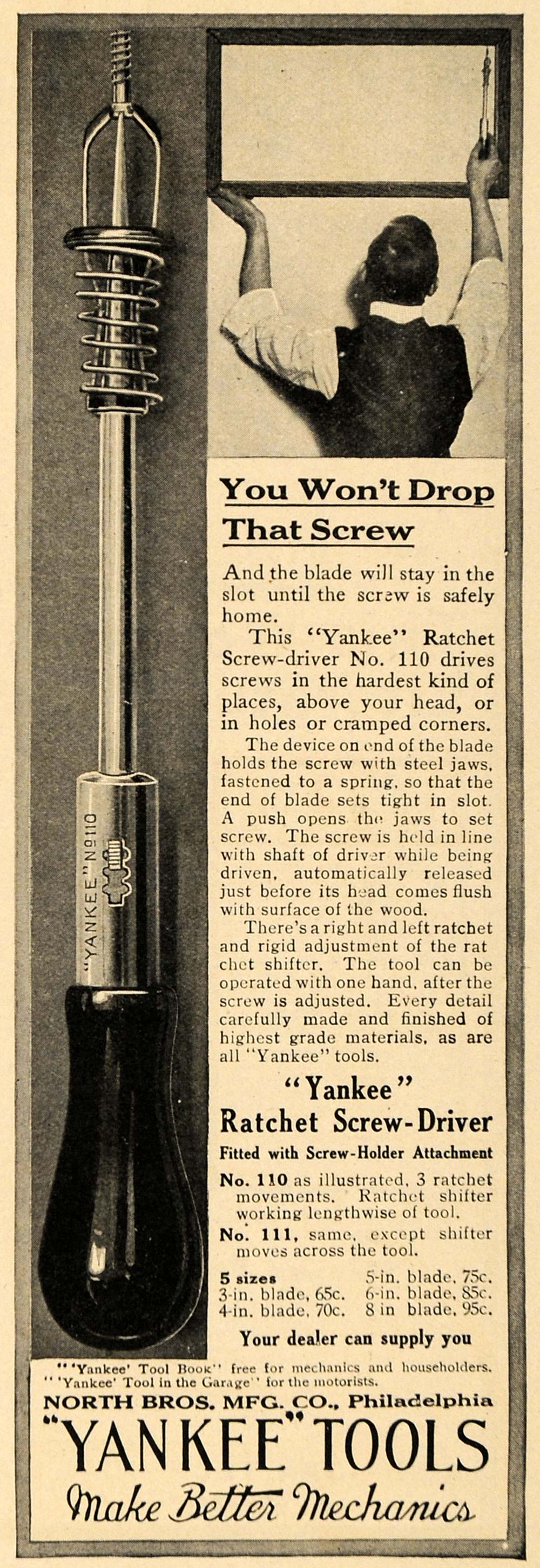 This is an original 1913 black and white print ad for the "Yankee" Ratchet Screw-Driver and other tools by North Brothers Manufacturing Company of Philadelphia.