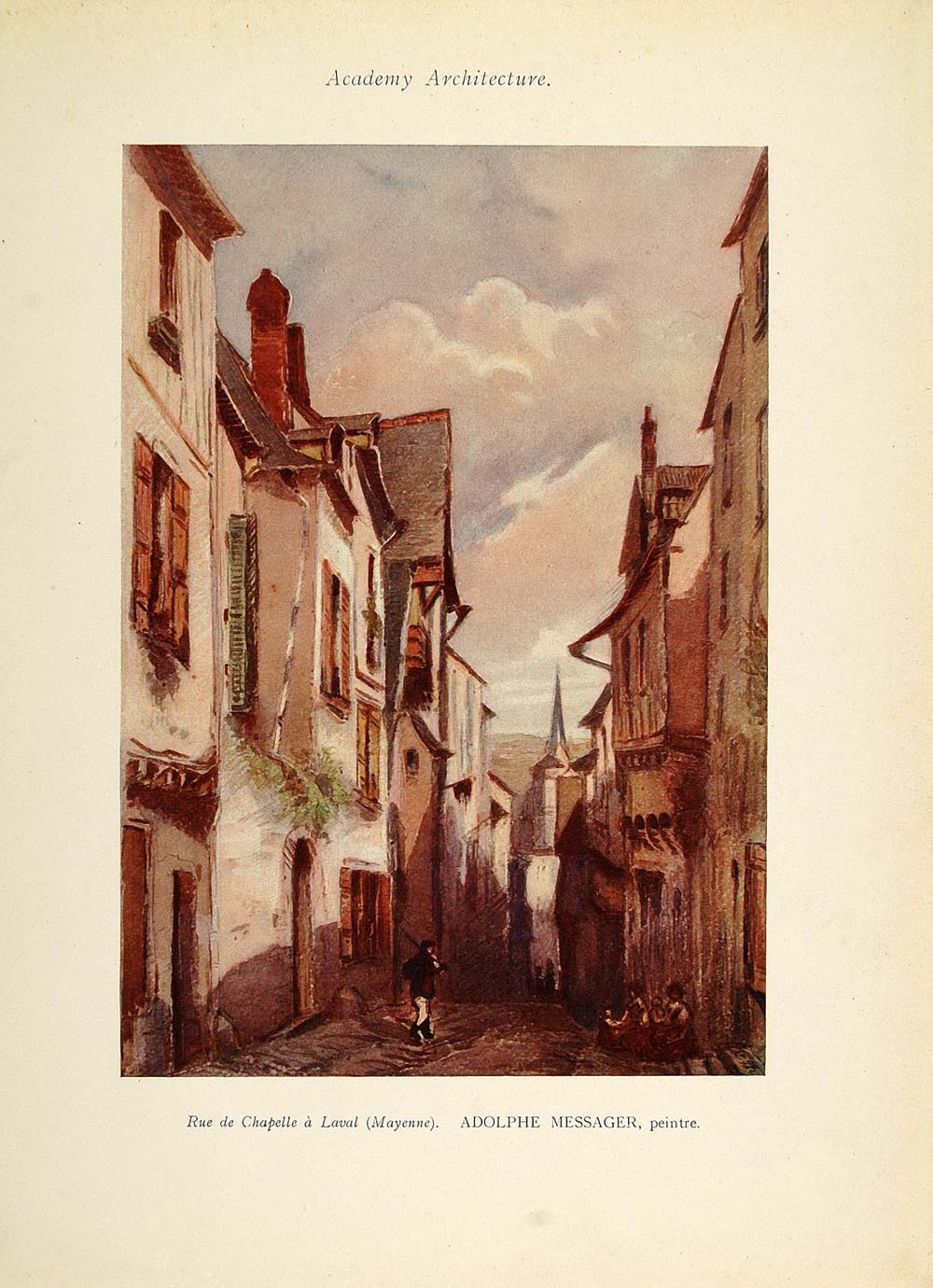 This is an original 1913 color print of a painting by Adolphe Messager of a street in Laval, Mayenne in the Loire Valley region of northern France.