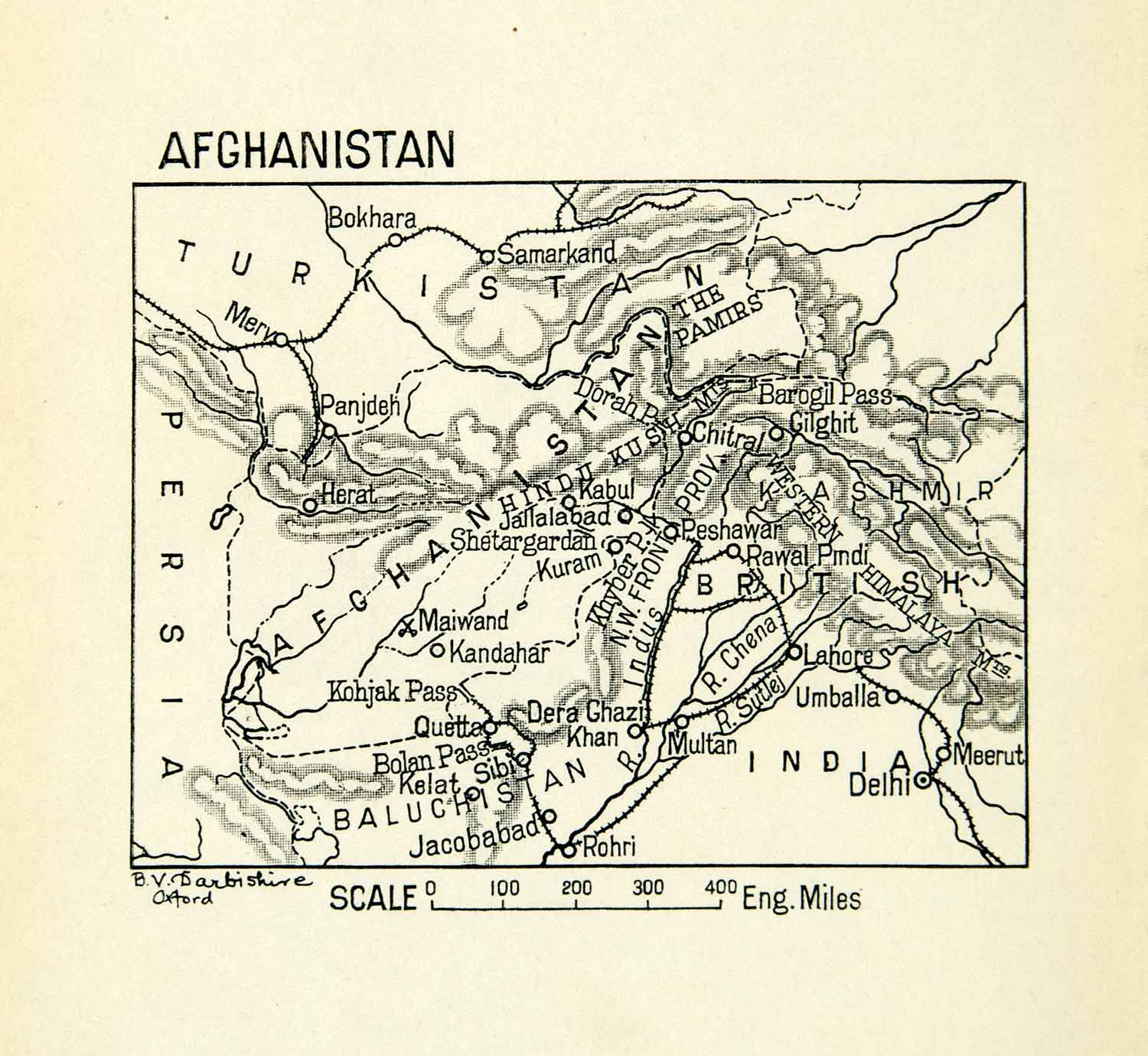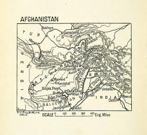 This is an original 1913 black and white relief line-block map of Afghanistan and the outlying regions.