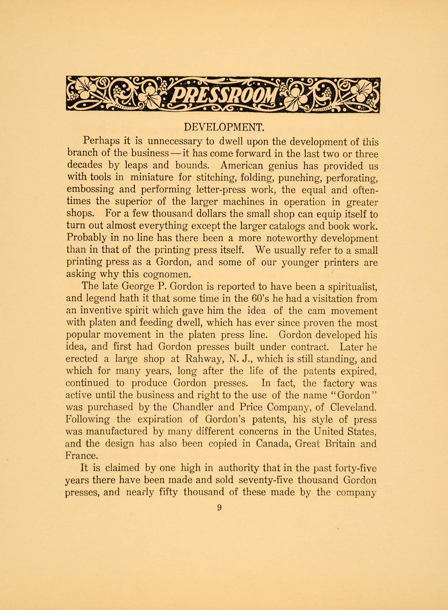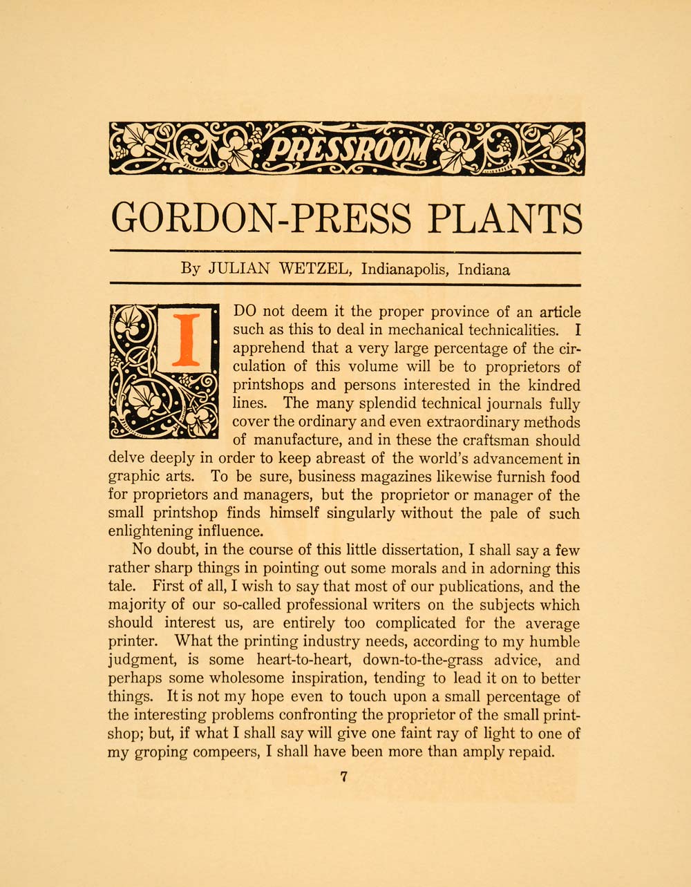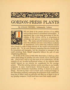 This is an original 1913 eight-page (4 pages, double-sided) lithographed article "Gordon-Press Plants" by Julian Wetzel of Indianapolis, IN from