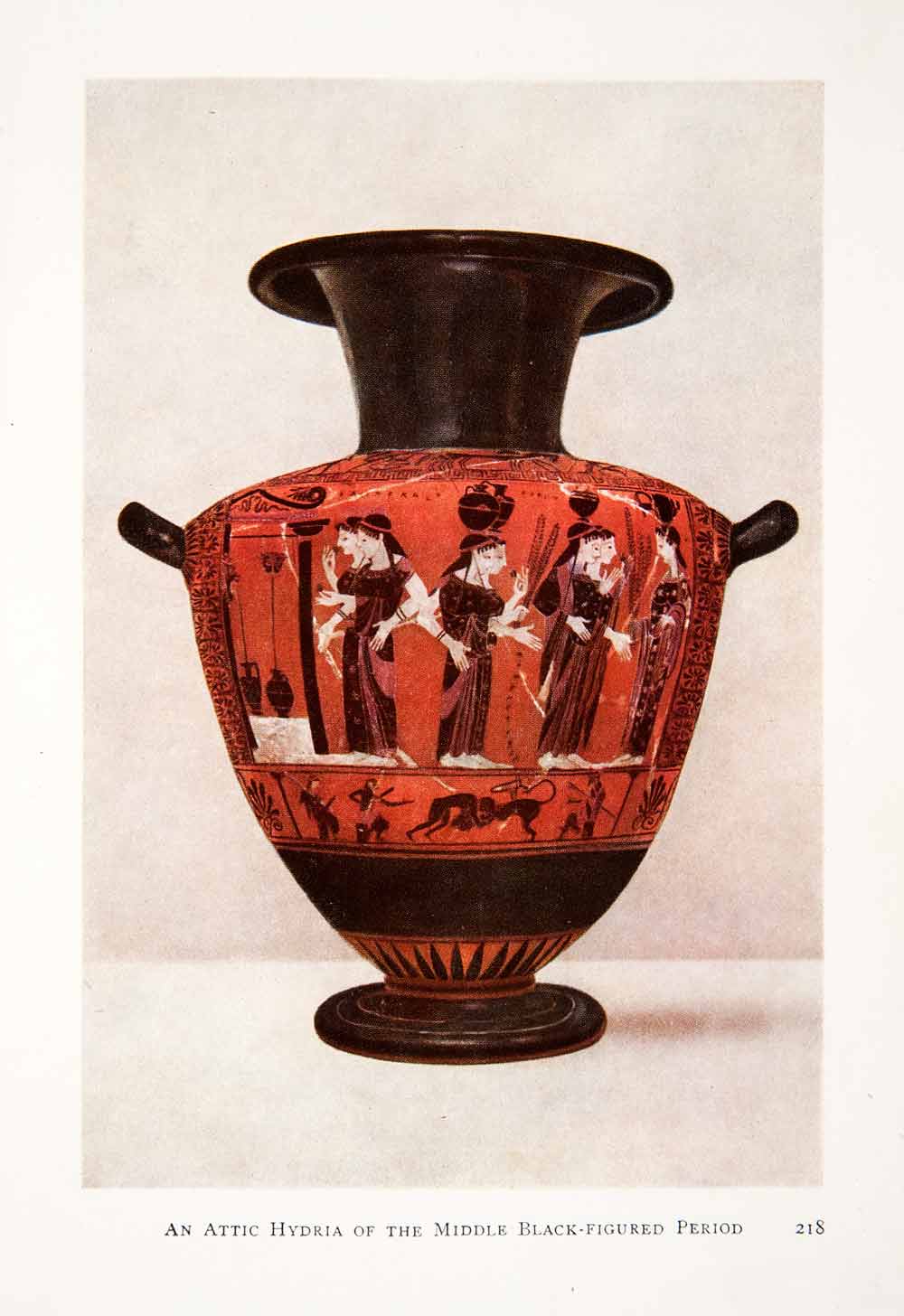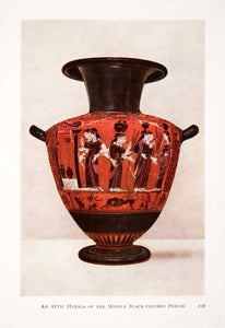 This is an original 1913 color print of an Attic Hydria in the middle of the black-figure period of Ancient Greece.
