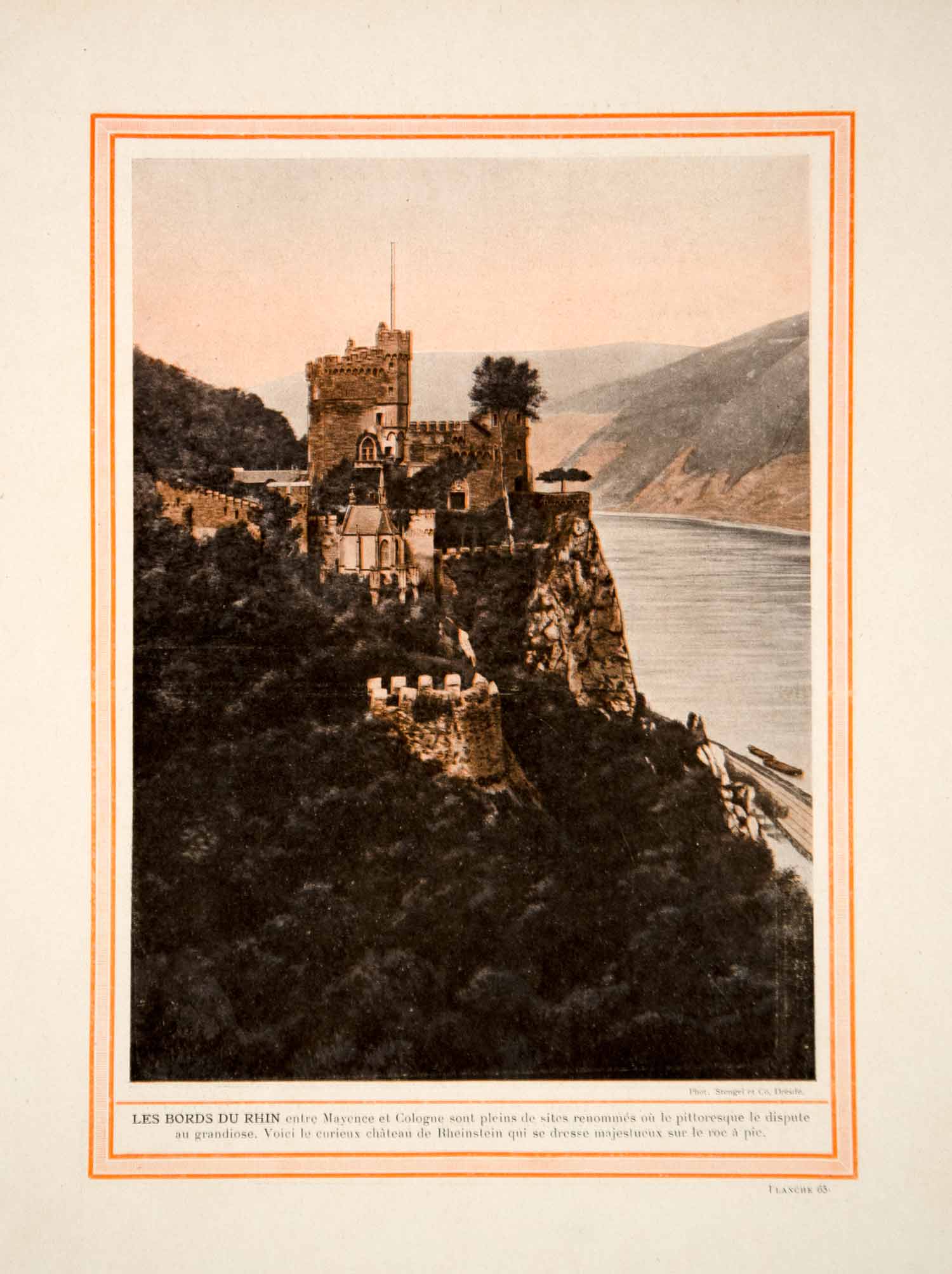 This is an original 1913 two-color print of Rheinstein Castle (Burg Rheinstein) on the Rhine River in Germany.