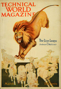 This is an original 1913 color cover for the March issue of Technical World Magazine, featuring an image by Frank B. Hoffman of a lion jumping and scaring a drove of sheep.CONDITION