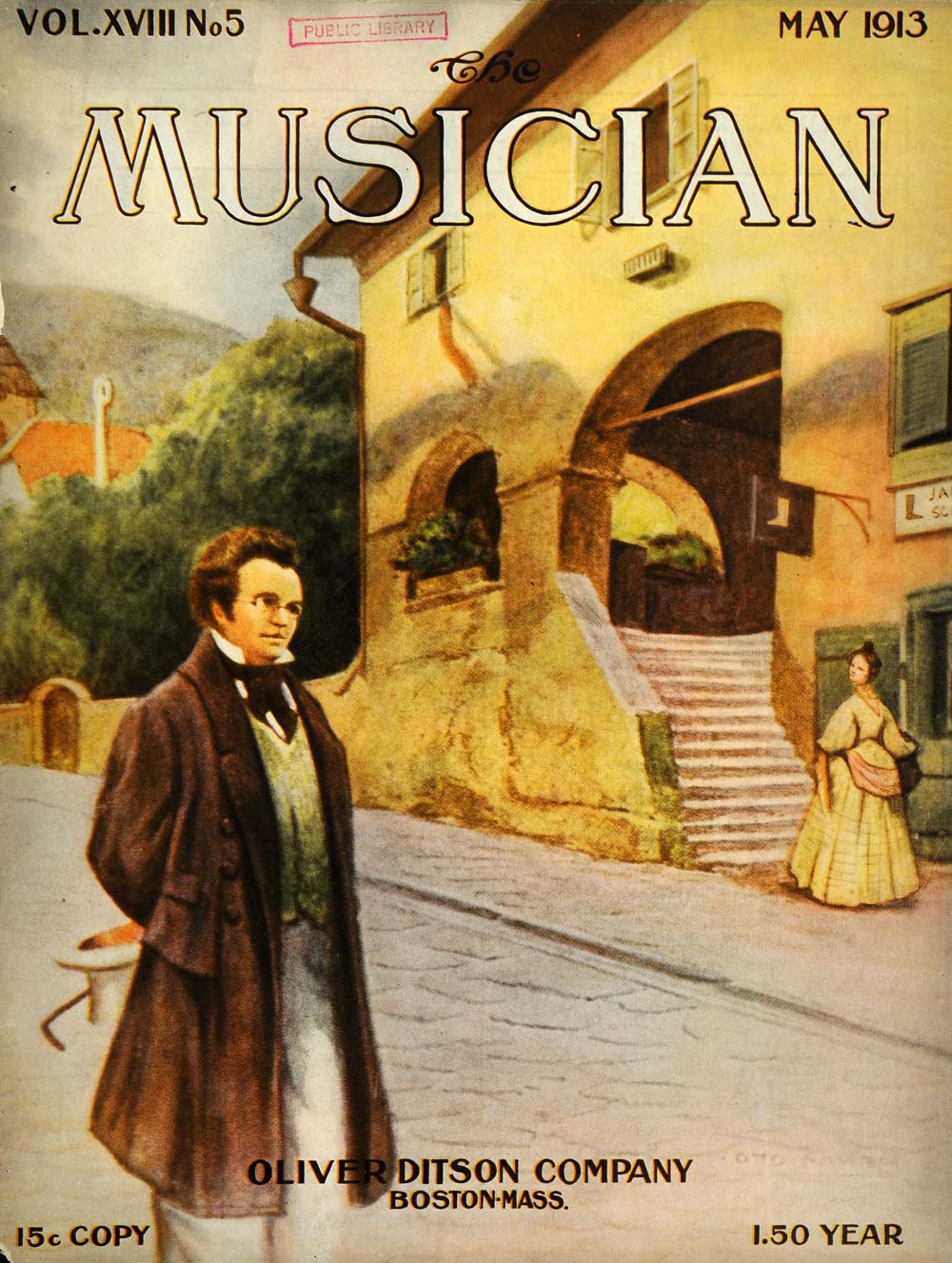 This is an original 1913 color cover for The Musician Magazine for May (Volume XVIII, No. 5) from the Oliver Ditson Company of Boston, Massachusetts. This cover features an illustration of the composer Franz Schubert in Vienna.CONDITION