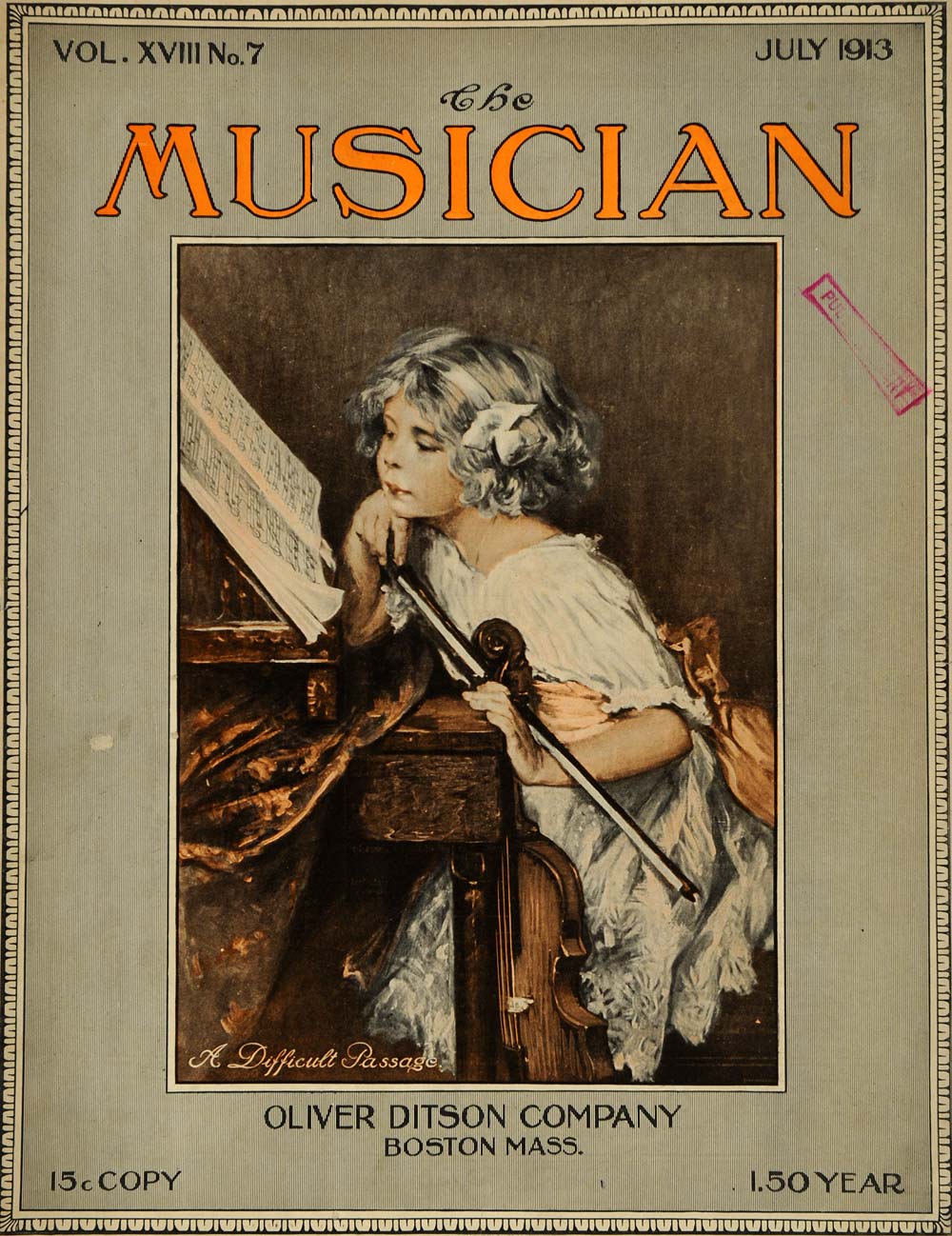 This is an original 1913 color cover for The Musician Magazine for July (Volume XVIII, No. 7) from the Oliver Ditson Company of Boston, Massachusetts. This cover features a young violinist trying her hand at "A Difficult Passage".CONDITION