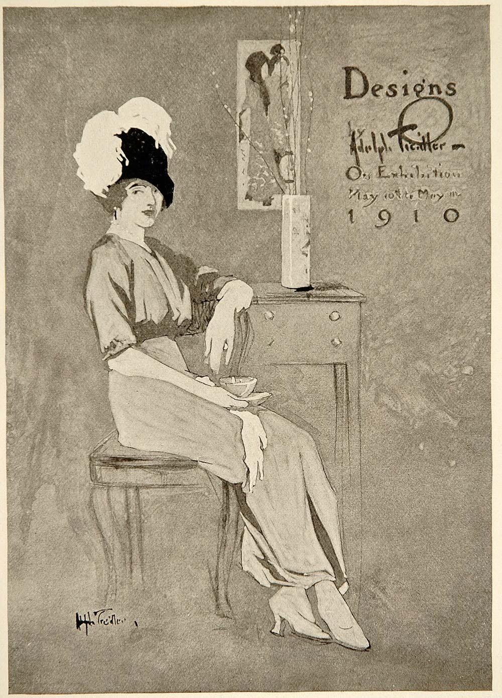 This is an original 1913 hand-tipped, halftone print of a poster, designed by Adolph Treidler in 1910, advertising an exhibition of designs by Adolph Treidler.