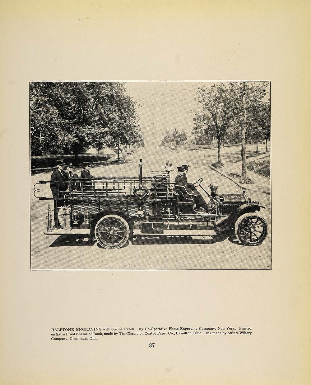 This is an original 1913 halftone print of an antique fire truck. Halftone engraving with 65-line screen by the Co-Operative Photo-Engraving Company, New York. Printed on Satin Proof Enameled Book made by The Champion Coated Paper Company, Hamilton, Ohio. Ink by Ault & Wiborg Company, Cincinnati. (Please note that there is printing on the reverse.)