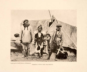 This is an original 1913 black and white halftone print of trading going on with a Esquimaux Indian family.