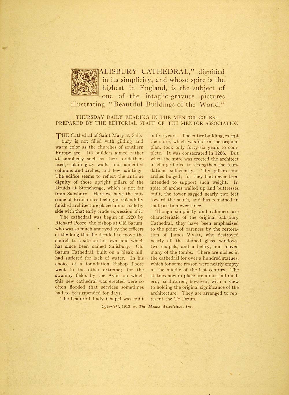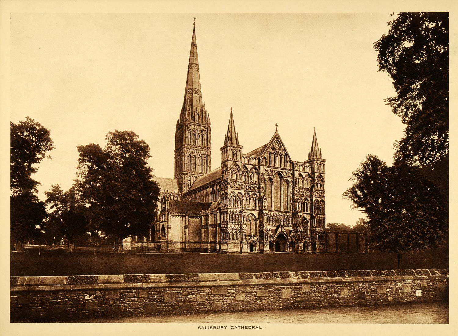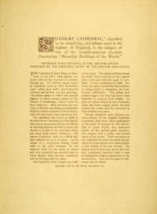 This is an original 1913 intaglio print of Salisbury Cathedral. On the reverse is a short article about the cathedral. Please see both images.