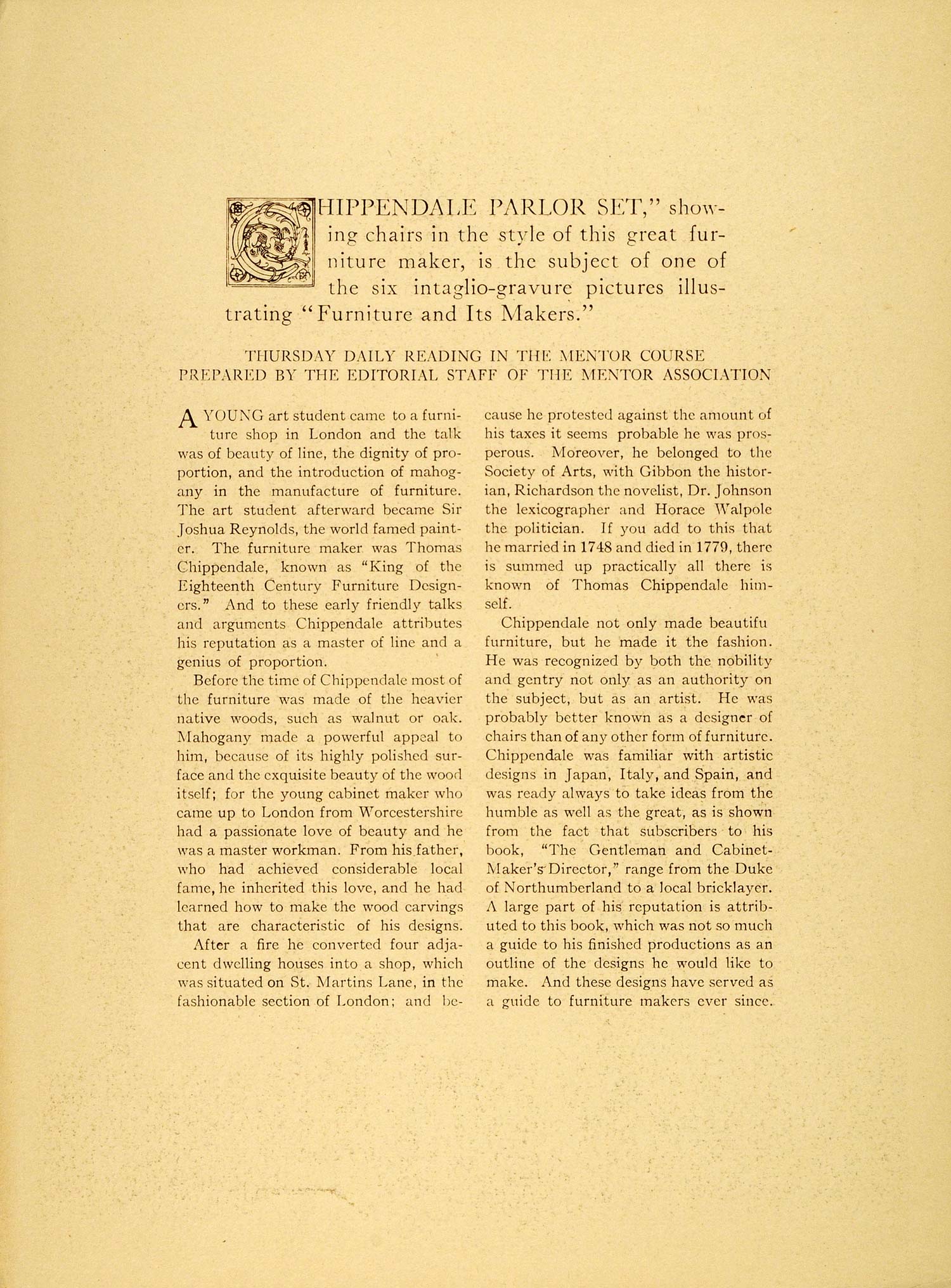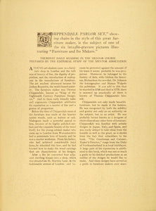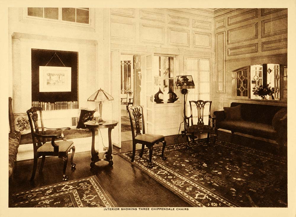 This is an original 1913 intaglio print of a parlor with three Chippendale chairs. On the reverse is a short article about the furniture maker, Thomas Chippendale. Please see both images.