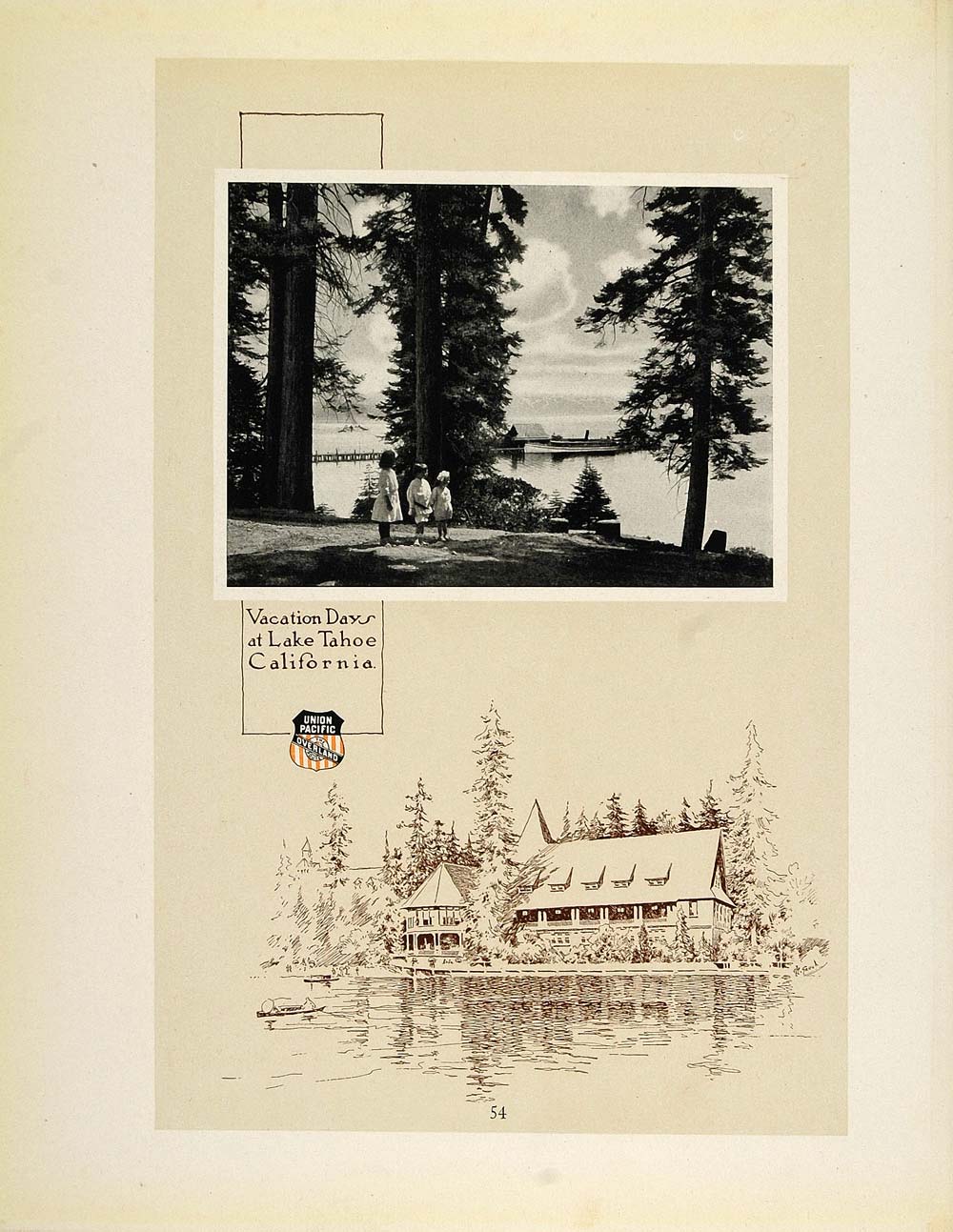 This is an original 1913 four-color lithograph advertising illustration for the Union Pacific Overland Route with a nice halftone image of Lake Tahoe, California. Capper Engraving Company, Kansas City, MO. (Please note that there is printing on the reverse.)
