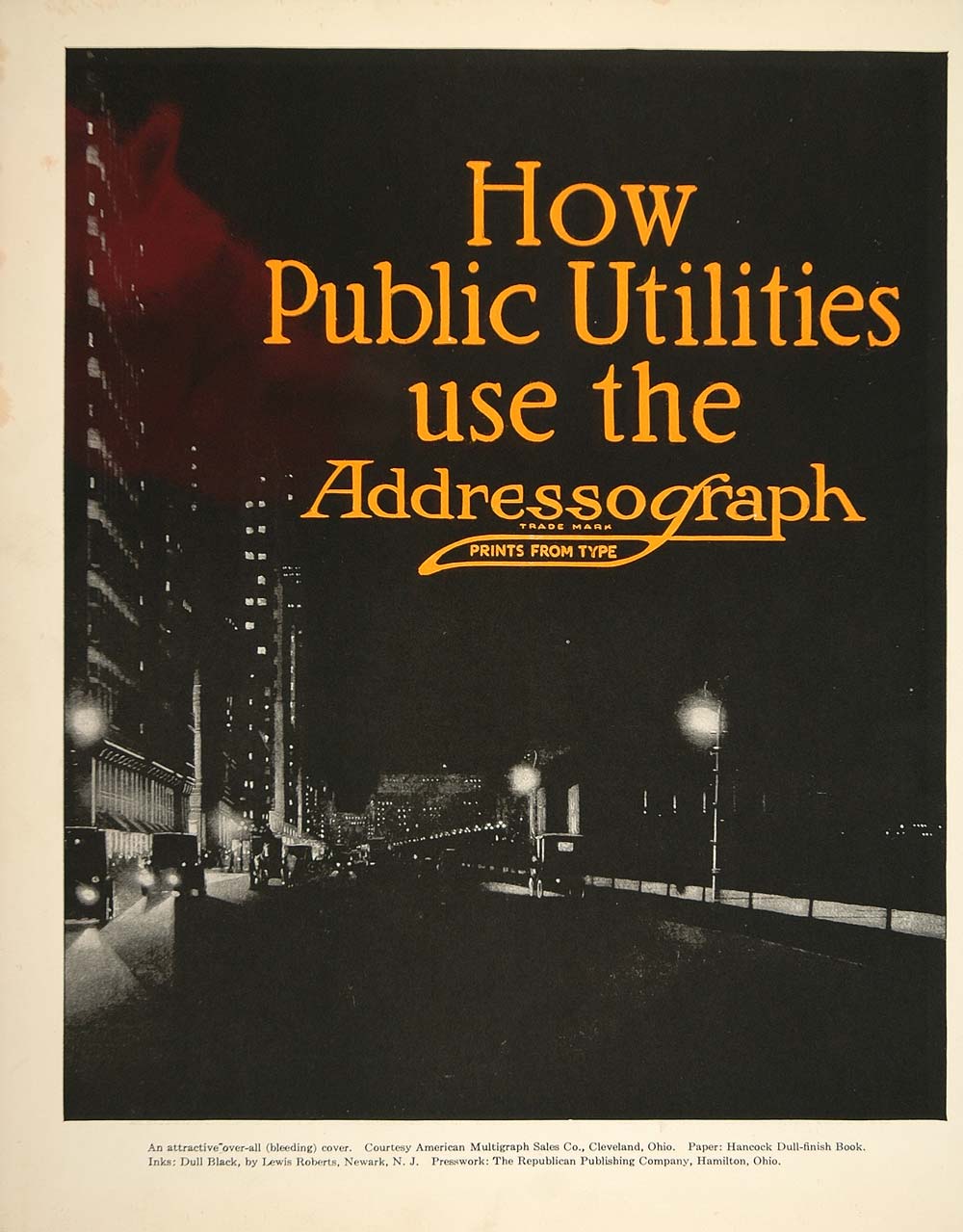 This is an original 1913 color print of a cover ad illustration for the American Multigraph Sales Co., Cleveland, Ohio. Paper: Handcock Dull-finish Book. Inks: Dull black by Lewis Roberts, Newark, N.J. Presswork by The Republic Publishing Co., Hamilton, Ohio. (Please note that there is printing on the reverse.)