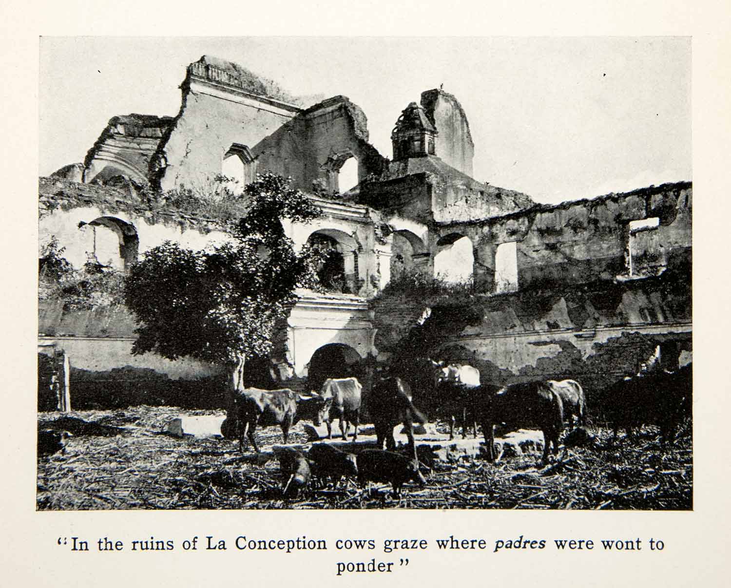 This is an original 1913 black and white halftone print of the ruins of the Roman Catholic convent of La Conception outside the city of Antigua, Guatemala.