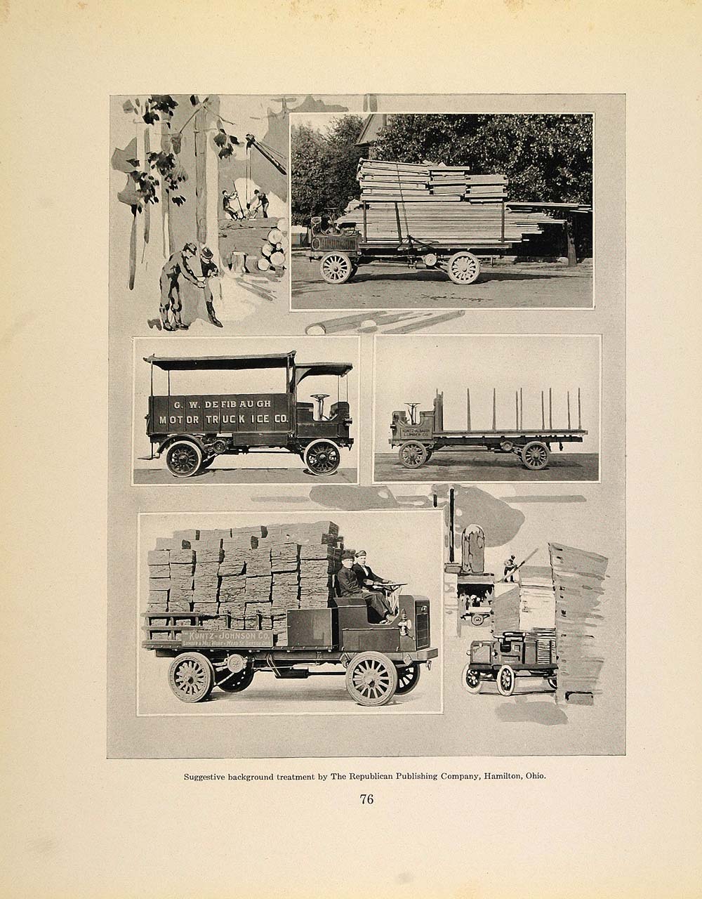 This is an original 1913 halftone print with a variety of vintage delivery trucks with the background treatment by The Republican Publishing Company, Hamilton, Ohio. (Please note that there is printing on the reverse.)