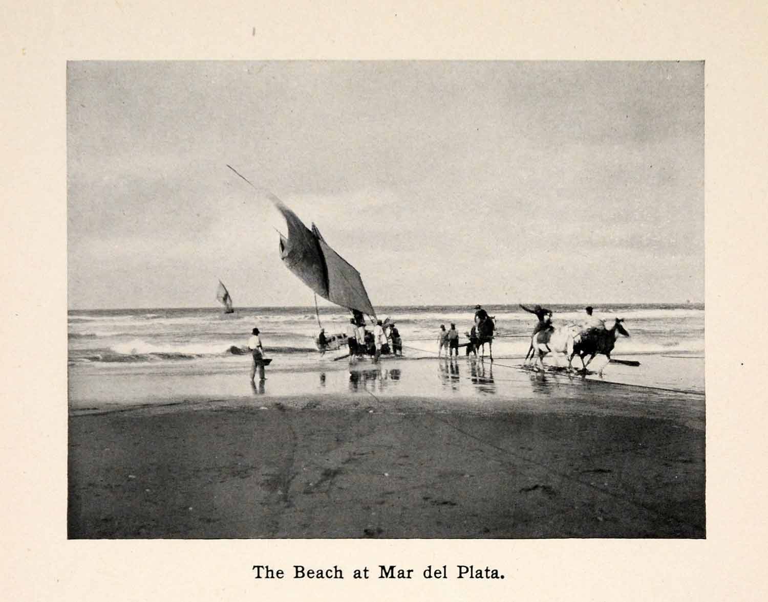 This is an original 1913 halftone print of the beach at Mar del Plata. Mar del Plata is an Argentine city located on the coast of the Atlantic Ocean south of Buenos Aires, and is the second largest city of Buenos Aires Province. It is one of the major fishing ports and the biggest seaside beach resort in Argentina.