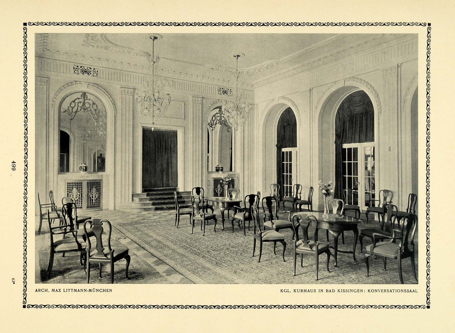 This is an original 1913 halftone print of Kurhaus in Bad Kissingen: Konversationssaal by Max Littmann. Littmann was a German architect who attened the Gewerbeakademie Chemnitz and the Technische Hochschule Dresden. He moved to Munich at was introduced to Friedrich Thiersch and Gabriel von Seidl. While there, he established himself as a free architect. He joined the contracting business of his father-in-law Jakob Heilmann, in 1891 which then turned into a general partnership as Heilmann & Littmann. Littmann was primarily interested in producing large pieces of work such as theaters, department stores and spas.