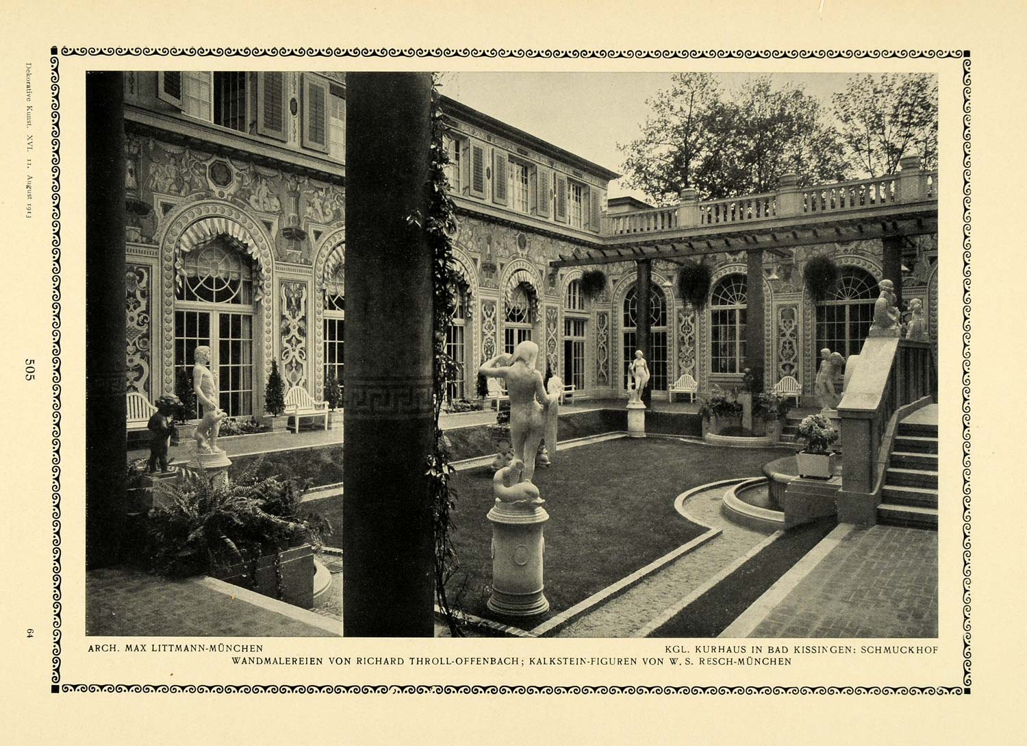 This is an original 1913 halftone print of Kurhaus in Bad Kissingen: Schmuckhof by Max Littmann with paintings by Richard Throll and limestone figures by W. S. Resch. Littmann was a German architect who attened the Gewerbeakademie Chemnitz and the Technische Hochschule Dresden. He moved to Munich at was introduced to Friedrich Thiersch and Gabriel von Seidl. While there, he established himself as a free architect. He joined the contracting business of his father-in-law Jakob Heilmann, in 1891 which then turned into a general partnership as Heilmann & Littmann. Littmann was primarily interested in producing large pieces of work such as theaters, department stores and spas.