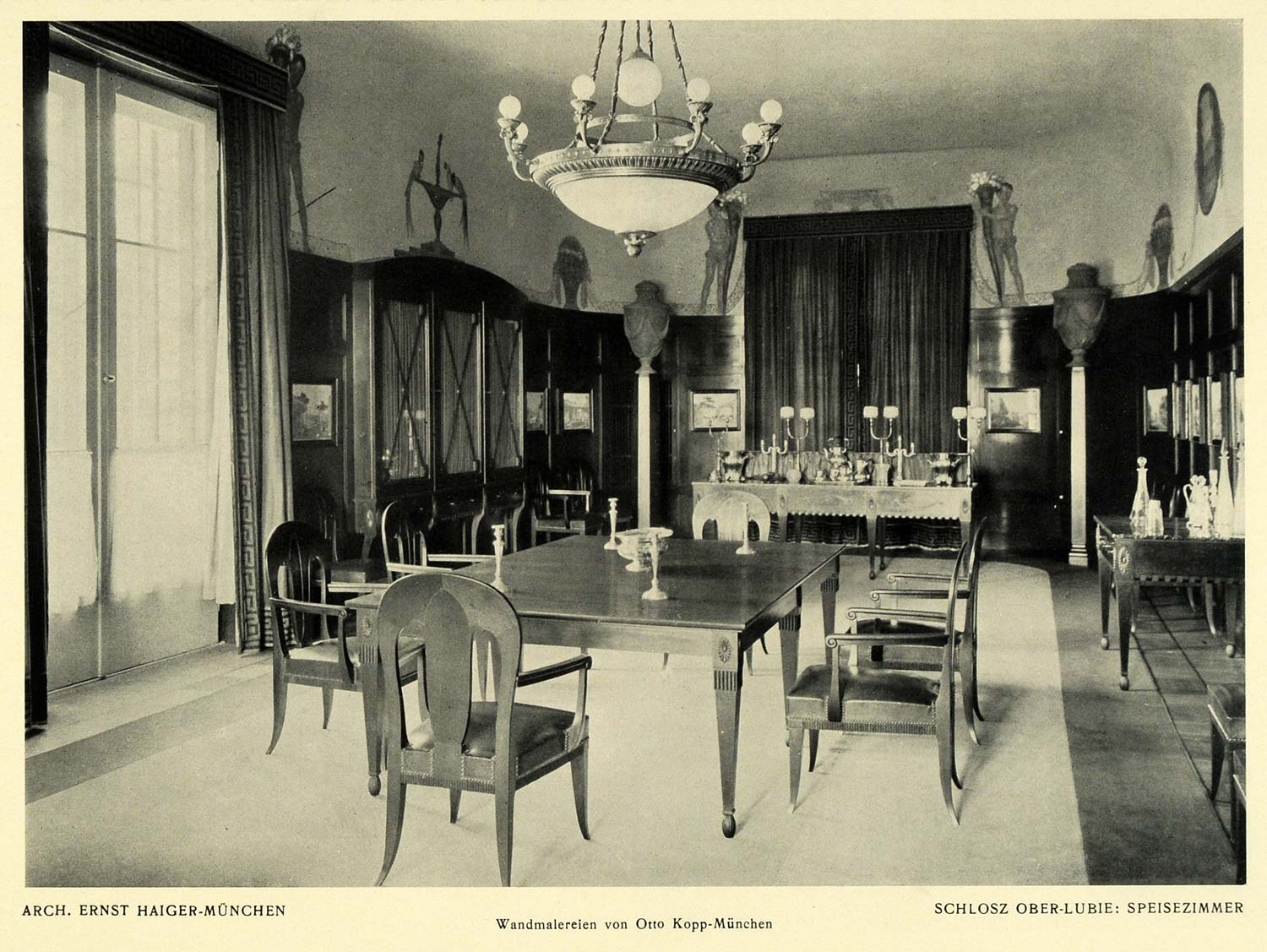 This is an original 1913 halftone print of Schlosz Ober-Lubie: Speiszimmer by Ernst Haiger. Haiger was a German architect who primarily used Art Nouveau and neoclassical art in his designs. He attended the Technical University of Munich under professors Josef Buhlmann, Heinrich Schmidt, and Friedrich von Thiersch, who was his most important teacher. He designed the Munich Fuehrer, a Casino for Hitler during the period of National Socialism. He also designed the bar in the Munich's Nazi exhibition buildings house the art.