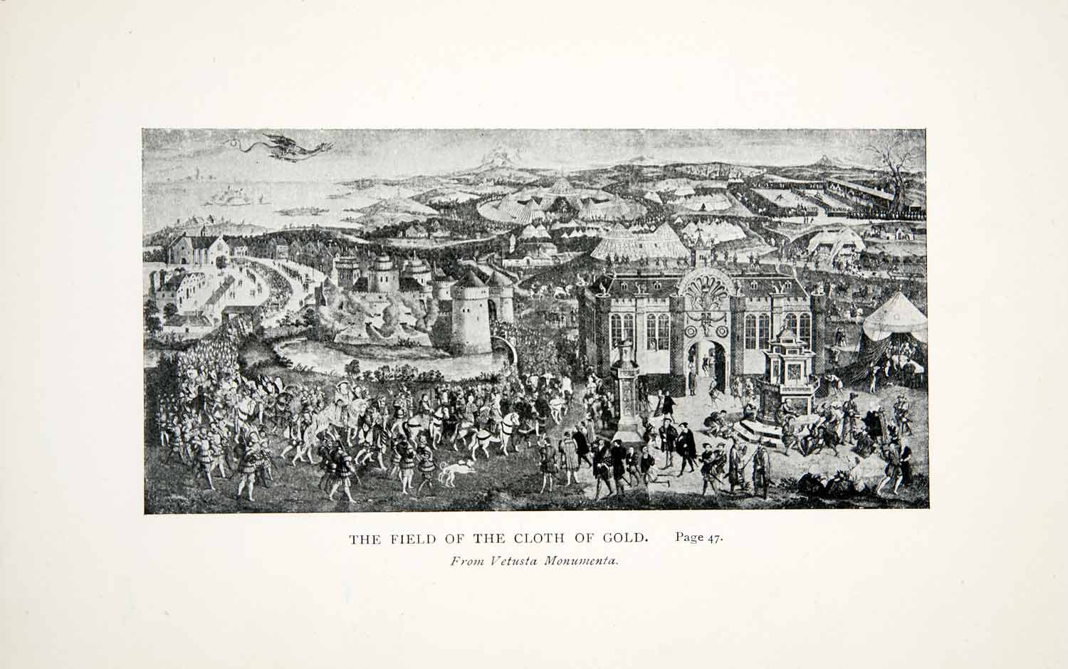 This is an original 1913 black and white halftone print of the meeting between French King Francis and English King Henry VIII at the Field of the Cloth of Gold near Calais, France. The meeting was held to discuss the outlawing of war between Christian nations.