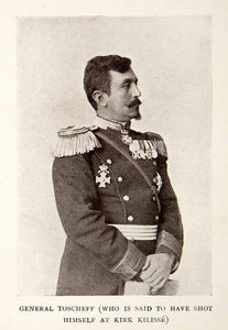 This is an original 1913 black and white halftone print of General Toscheff of Bulgaria. He was a commanding general at the Battle of Kirk-Kilissé during the Balkan War. He ordered the Taranova regiment to pursue the retreating Turkish forces, however only 1,200 of the 9,000 soldiers of the regiment returned. Disgraced, and stripped of his rank by King Ferdinand, Gen. Toscheff committed suicide shortly afterward.