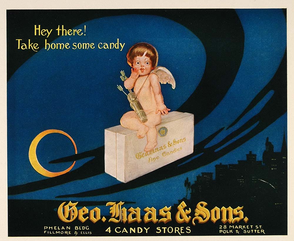 This is an original 1913 color print of an advertising poster for Geo. Haas & Sons candy stores with a charming cupid illustration. Reproduced by four-color process by the Scientific Engraving Company, New York City, from the original poster in the collection of the International Art Service of New York. Printed by The Republican Publishing Company, Hamilton, Ohio, with inks made by the Eagle Printing Ink Company. (Please note that there is printing on the reverse.)
