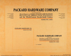 This is an original 1913 print of a sample letterhead, envelope, and business card for the (fictitious?) Packard Hardware Company, Hamilton, Ohio. Set in Monotype Series Nos. 164J, 86J and 88, cast on Lanston Monotype, and printed on "BPF" Book made by Geo. W. Wheelright Paper Co., Boston, with ink by Eagle Ink Company. (Please note that there is printing on the reverse.)