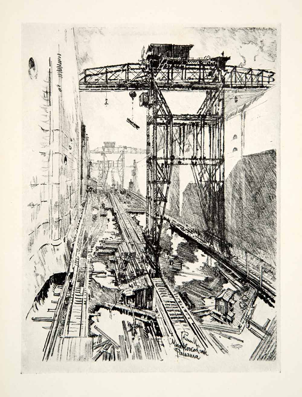 1913 Print Joseph Pennell Art Construction Crane Miraflores Lock Panama XAOA2