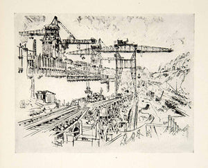 This is an original 1913 black and white halftone print of a lithograph by Joseph Pennell of the construction cranes that were used to build the Miraflores Lock along the Panama Canal in South America.