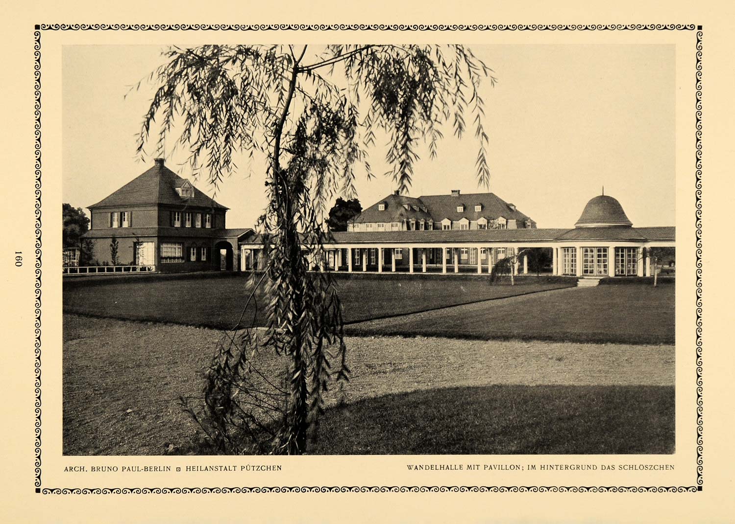 This is an original 1913 halftone print of the Pützchen Heilanstalt. The architect of the building is Bruno Paul. Shown in the image is the pavilion.