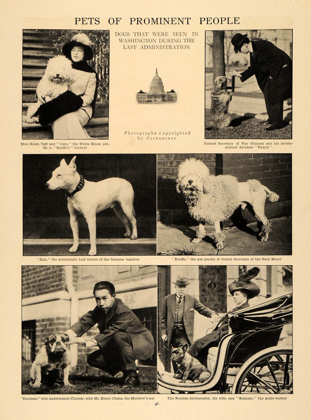 This is an original 1913 halftone print featuring images of famous people and their pets. The images include Miss Helen Taft with "Caro", Stimson's airedale, "Punch", "Kim", the bull terrior of the Siamese legation, Secretary of the Navy Meyer's poodle, the Russian Ambassador's boston terrier, and Mr. Henry Chang's son and "Duchess".