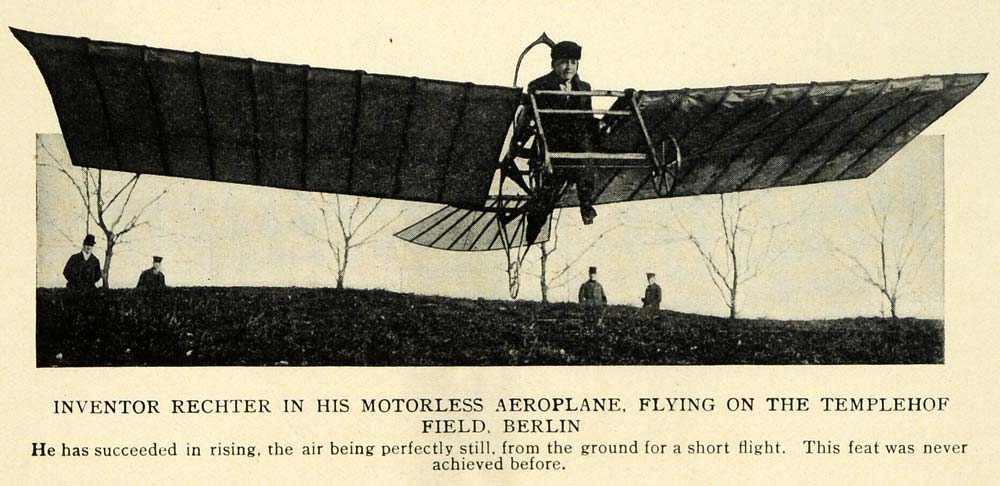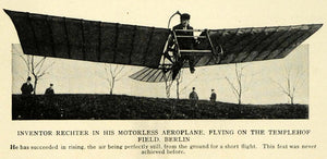 This is an original 1913 halftone print of a motorless aeroplane flying on the Templehof Field in Berlin, as invented by a man named Rechter. It achieved taking off and remaining in the air for a short time, which had not been done at this time by any aircraft.