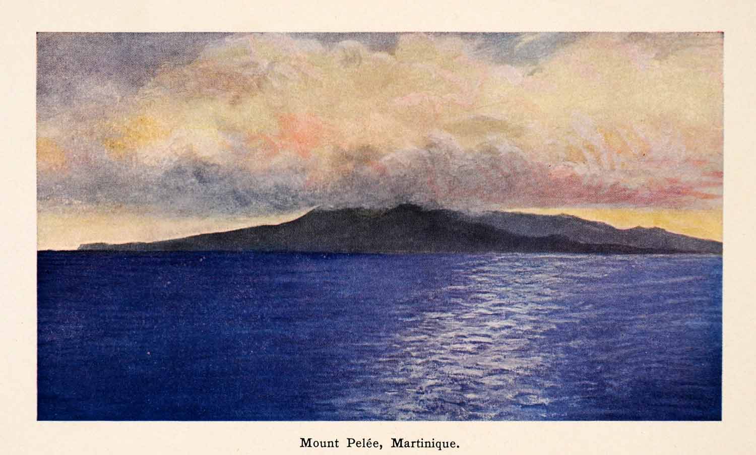 This is an original 1913 color print of a sketch of Mount Pelee, Martinique in the French Caribbean Islands. It is a print of an original water-color sketch possibly done by W. J. Holland, author of "To The River Plate and Back"; 1913.
