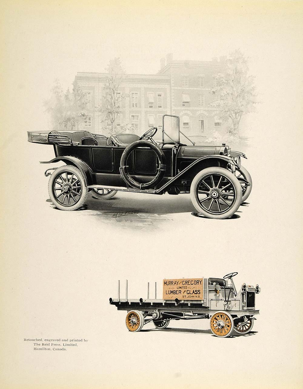This is an original 1913 print of an illustration of an antique car and delivery truck. Retouched, engraved and printed by The Reid Press, Ltd., Hamilton, Canada. (Please note that there is printing on the reverse.)