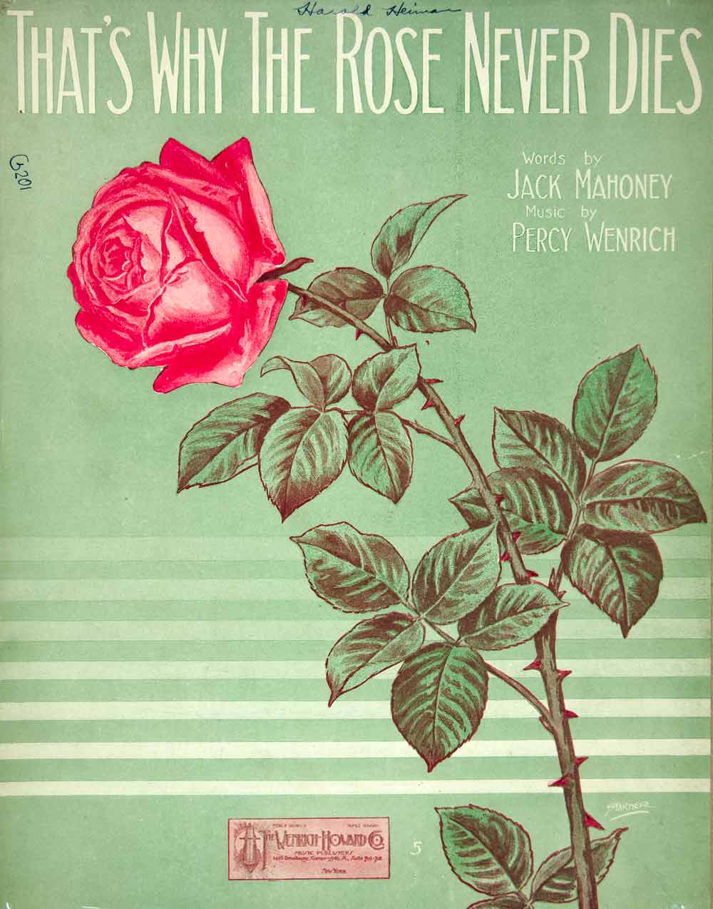This is an original 1913 piece of sheet music. Words by Jack Mahoney and music by Percy Wenrich. Copyright © 1913 by Wenrich-Howard Co. The cover design by the Starmer brothers, William Austin Starmer and Frederick Waite Starmer, features a large red rose.